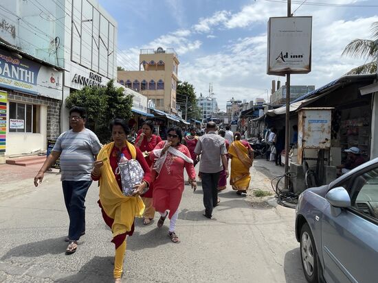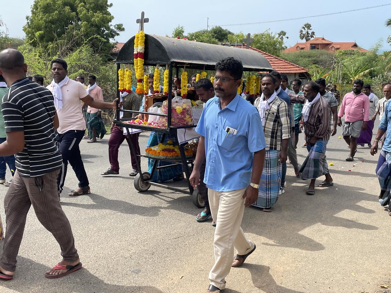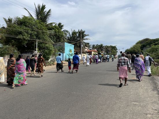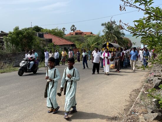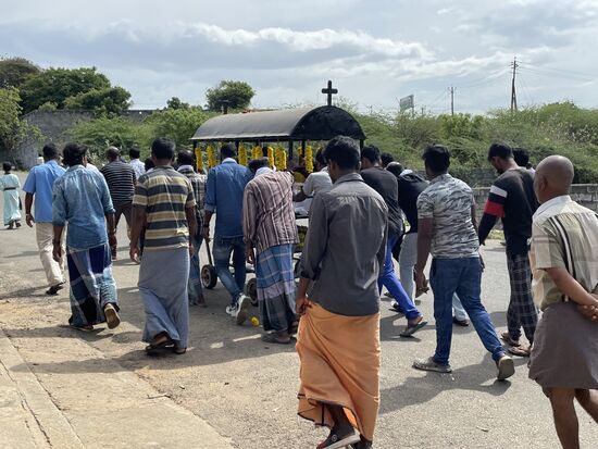 Also laufe ich los. Auf dem Weg kommt mir eine grössere Menschengruppe entgegen. Erst kurz bevor sie auf meiner Höhe sind, merke ich, worum es sich handelt. Es ist eine Beerdigung. Der Tote liegt auf einem offenen Wagen, ohne Sarg aber mit vielen Blumen. Voraus laufen zwei Ministranten, ihnen folgt der Priester und dann eine Gruppe Männer mit der Leiche auf einem einfachen Wagen. Einer der Männer streut Blumen auf den Weg und wirft sie in regelmässigen Abständen über den Wagen. Hnter den Männern folgen die Frauen in ihren schönen Saris und dann folgen ein paar Leute, die wahrscheinlich nicht zu den engsten Angehörigen zählen. Die Gruppe kommt von einer christilichen Kirche, die nahe am Meer steht. Ich höre ein leises Murmeln. Gebete?