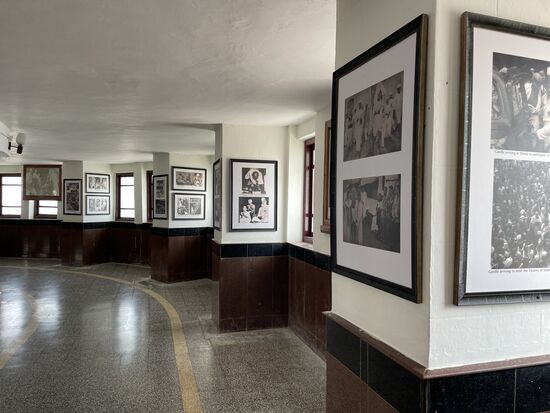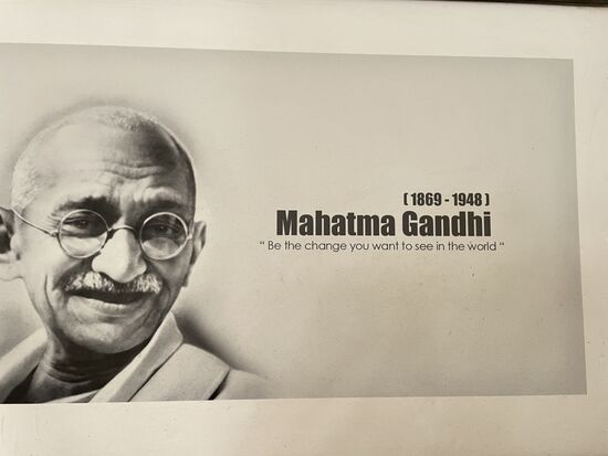 Danach geleitet er mich entlang der Wände, macht mich hie und da auf eine der vergilbten Fotos aufmerksam. Gandhi mit verschiedenen Persönlichkeiten, Gandhi beim Gebet, bei der Meditation. Auch seine Eltern kann man auf einem der alten Fotos sehen. Er entstammte einer guten Familie, die zur Oberschicht des Landes gehörte. In London studierte er Jura, lebte danach ein paar Jahre in Südafrika und kam nach Indien zurück, als er sich bereits einen Namen als Kämpfer für die Unabhängigkeit Indiens gemacht hatte. Damals war Indien noch eine englische Kolonie.