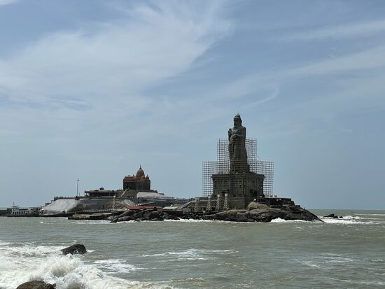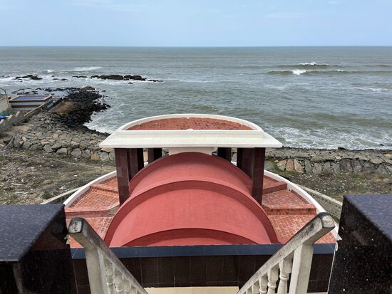 1948 wurde er von einem fanatischen Hindu erschossen. Seine Asche wurde hier in Kanyakumari dem Meer übergeben. Hier, an diesem speziellen Ort, wo drei Ozeane zusammentreffen fand er seine letzte Ruhe.