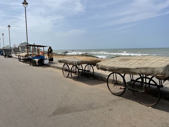 Ich bummle dem Meer entlang, wo ich gestern schon mit meinen Tuktukfahrer unterwegs war. Die vielen Verkaufsstände, die gestern bei Sonnenuntergang geschlossen wurden, stehen auch jetzt noch verlassen da. Ich wundere mich, dass die einfachen Vehikel so allein hier stehen. Ich kann nicht sehen, dass sie irgendwie bewacht wären, aber wahrscheinlich hat irgendwo jemand ein Auge darauf.