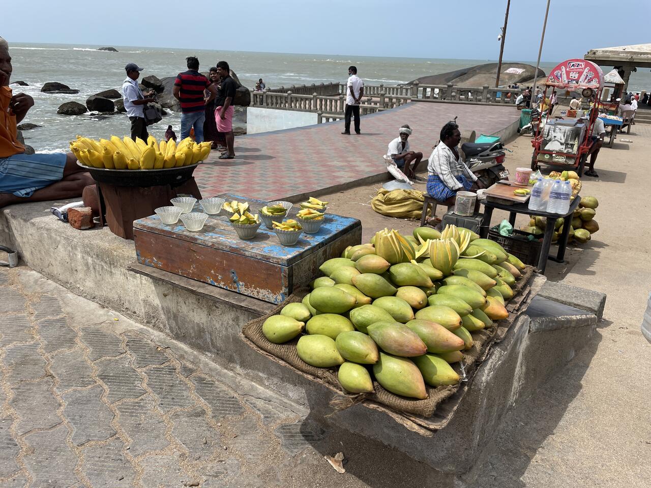 Ich bummle zum Meer, komme an vielen Ständen vorbei, die jetzt ihre Auslagen ausbreiten. Sie verkaufen hier vor allem Esswaren. Mangos und Kokosnüsse und andere Früchte. Unten am Meer sehe ich eine Weile einem der allgegenwärtigen Fotografen zu, der eine ganze Gruppe von Indern fotografiert. Er hat einen guten Standort gewählt. Hinter seinen Fotosujets wirft das Meer immer wieder hohe schäumende Wellen über die Felsen. Das muss gute Aufnahmen geben.