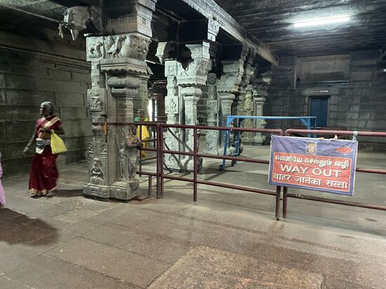 Jetzt geht es weiter, vorbei an Frauen, die am Boden sitzen. Genauso wie ich hereingekommen bin, folge ich den Menschen und komme in einen helleren Bereich mit mehr Licht. Hier verkünden die Schilder Way out. Hier gibt es sogar einen Verkaufsstand und hier traue ich mich, die Kamera wieder hervor zu holen. Ich brauche ein Bild, sonst habe ich am Schluss das Gefühl, ich hätte geträumt. Hier hat auch niemand mehr etwas dagegen. Das Pulver lasse ich an einer Säule, die schon ganz rot ist von vielen Pulverresten. Mit einem grossen Umweg durch breite Gänge bin ich plötzlih wieder am Eingang, wo mir ein Mann zuwinkt. Er gibt mir die 30 Rupien Rückgeld. Die hatte ich inzwischen längst vergessen.