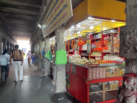 Ich folge den Menschen und mir kommt das ganze wie ein grosses Labyrith vor. Es geht immer tiefer hinein. Der Raum ist vielleicht 5 Meter hoch, aber durch die Dunkelheit und die Ausdehnung des Raumes scheint er niedrig. Immer tiefer geht es, ich habe das Gefühl, dass ich mich der Mitte des Raumes nähere. Es sind viele Menschen unterwegs. Männer mit nacktem Oberkörper, und langen Tüchern, die sie zum Teil abenteuerlich um die Hüften und Beine drappieren. Frauen in farbigen Saris, Kinder an den Händen oder auf dem Arm. Irgendwo kann man Opfergaben kaufen. Lotusblumen, Bananen, auf einem Bambusteller drappiert mit Blumen und kleinen Gaben.
