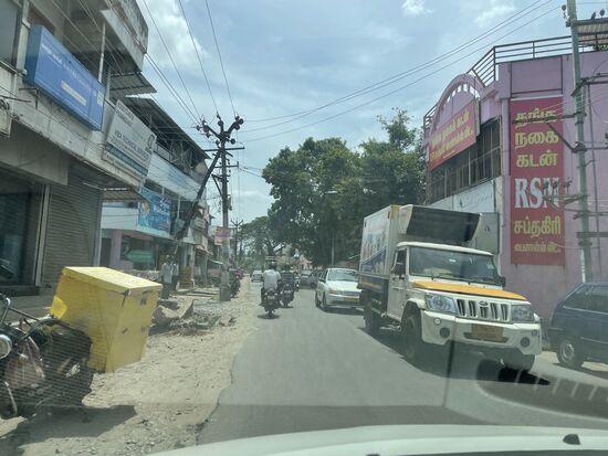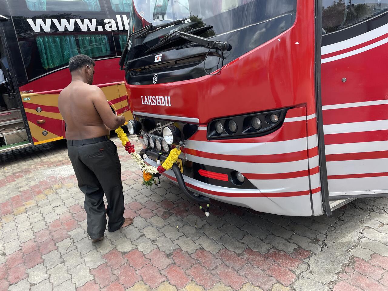 Bei der Busstation geht es nicht lange, bis ich einen Anbieter finde, der um 14.00 losfährt und dreineinhalb Stunden später in der Nähe von Madurai anhalten werde. Er wolle mir einen Privatwagen organisiere, der mich dort abhole und für wenig Geld zum Hotel fahren werde, verspricht mit der Verkäufer meines Tickets. Dann erklärt er dem Chauffeur, wo ich hinwill und schon bald fahren wir los.