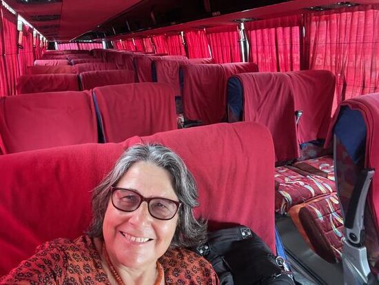 Wir fahren tatsächlich los, obwohl ich der einzige Passagier bin. Vorne ist der Chauffeur und sein Assistent, der vorhin meinen Koffer im Gepäckabteil verstaut hat. Wenig später steigen noch zwei Männer zu, viel später eine Frau. So fahren wir über die Autobahn. Die Fenster rundum sind verhangen und vor allem zum Chauffeur trennt mich ein roter Vorhang. Trotzdem kann ich knapp erkennen, dass wir mit ziemlichem Tempo unterwegs sind und alles was in den Weg kommt, wird weggehupt. Wir fahren nahe an andere Fahrzeuge auf und überholen dann rechts oder links. Die Strasse ist beidseitig zweispurig, und es verkehren nebst Autos und Lastwagen auch Motorräder und Tucktucks darauf.