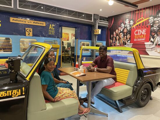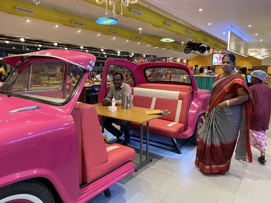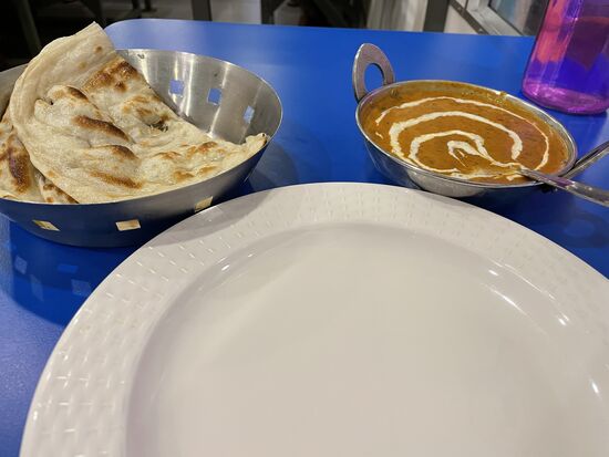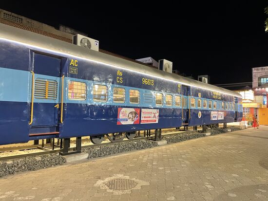 Tatsächlich ein sehr spezieller Ort. Mit einem grossen Saal, der sich nach und nach füllt, zwei Autos, in denen man sitzen kann und einem grossen Bahnwagen. Hierher bringt mich die nette Empfangsdame und als ich die riesge Karte sehe, merke ich, dass ich von indschem Essen noch immer keine Ahnung habe.