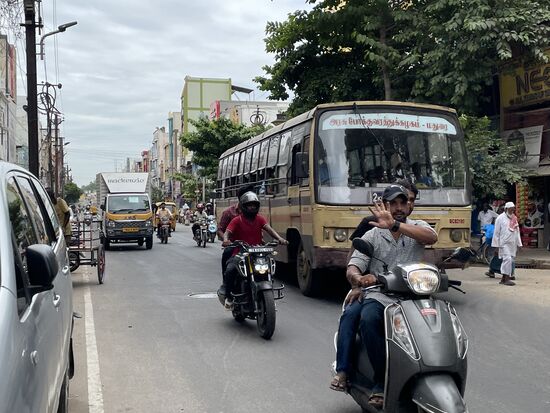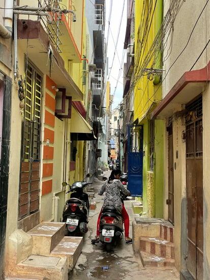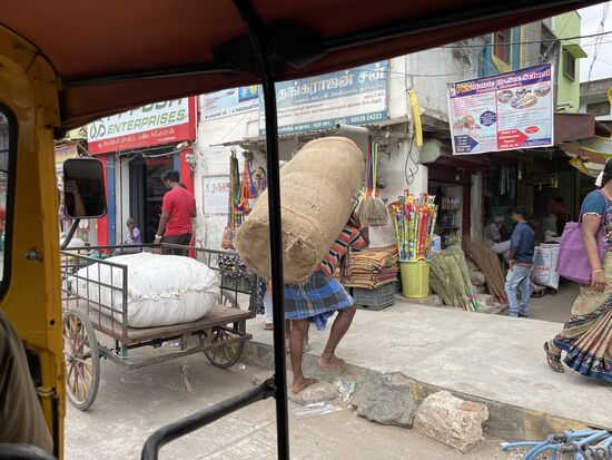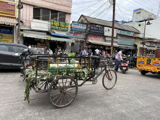 Auf dem Weg treffe ich immer wieder auf weisse Zeichnungen vor Hauseingängen. Ich habe darüber gelesen. Vor allem hier in den südlichen Bundesstaaten Tamil Nadu und Kerala zeichnen die Frauen, nachdem sie den Vorplatz mit Wasser und Kuhdung gereinigt haben, diese Zeichen mit Reismehl. Sie haben verschiedene Bedeutungen, die vor allem religiös geprägt sind, sie können aber zum Beispiel auch die Konzentration fördern.