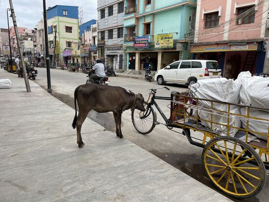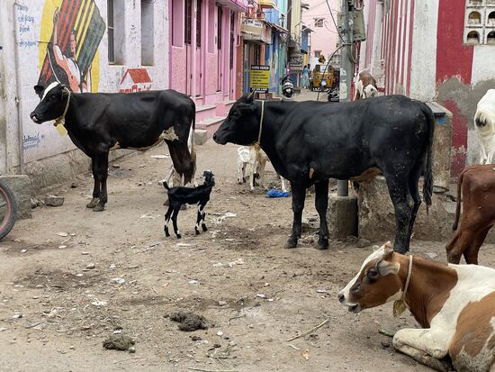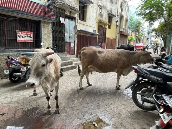 Irgendwo treffen wir in schmalen Gassen wieder auf Kühe, sogar mit Kälbern. und Ziegen. Hier wird allerdings nicht gehupt. Nein, es wird ganz manierlich um die Kühe herumgefahren oder sogar einen Moment gewartet, bis sie selber Platz machen. Niemand vertreibt sie, ganz im Gegenteil zu den streunenden Hunden, die schon mal mit einem Stecken verjagt werden. Der Umgang mit Tieren ist auch hier wieder sehr schwierig anzusehen.