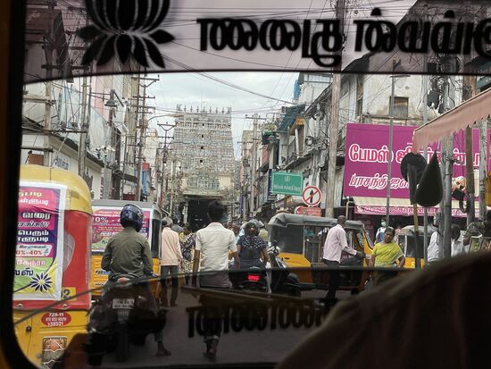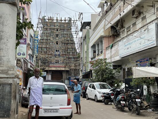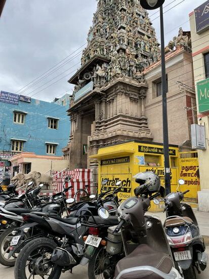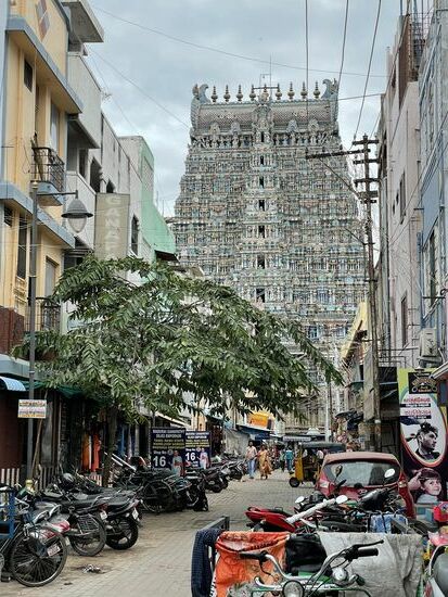 Mit den Tempeltürmen hört es jetzt allerdings überhaupt nicht mehr auf. Und langsam erkenne ich auch ein Muster. Die Mauern, die nicht mit unzähligen Figuren bestückt sind, sind meistens rot/weiss bemalt. das war auch beim grossen Schrein in Kanyakumari am Kap genauso. Nur hatte ich damals noch nicht gewusst, dass das überall so ist.