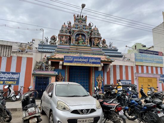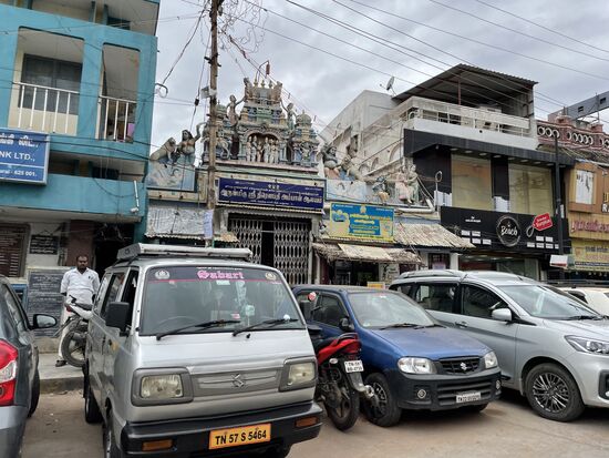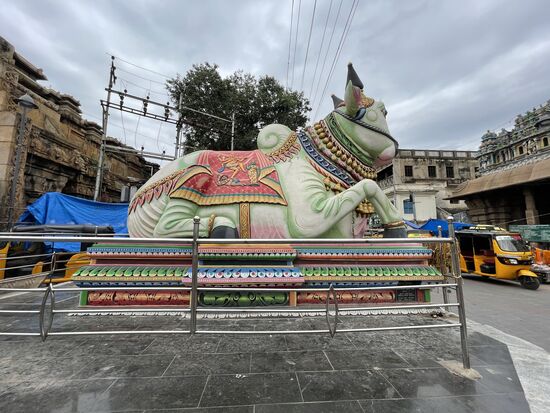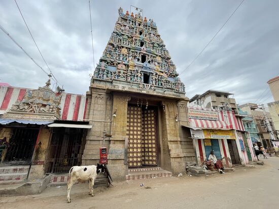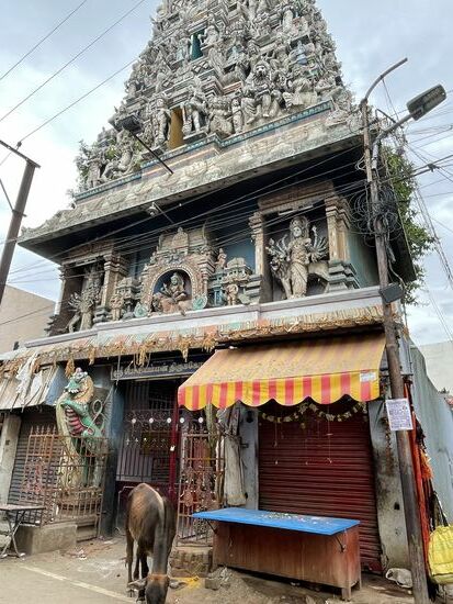 Und dann treffe ich tatsächlich die erste Kuh in der Stadt. Ist das jetzt eine dieser heiligen Kühe? Ein junges Rind, das grad etwas grünes frisst, das aber definitiv kein Gras ist. Eher eine grün gefärbte Schnur. Das scheint nicht wirklich ein heiliges und behütetes Leben zu sein, das diese Tiere in der Stadt erleben. Sie wären vor allem in der Nähe von Hindutempeln anzutreffen, hatte mir Titu, mein Fahrer von Kovalam erzählt. Nun, Hindutempel gibt es hier zur Genüge. Grad steht wieder einer vor mir, allerdings sind sie im Moment alle geschlossen, ich kann nur einen Blick durch die Gittertüre erhaschen.