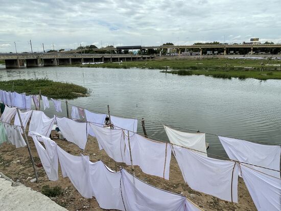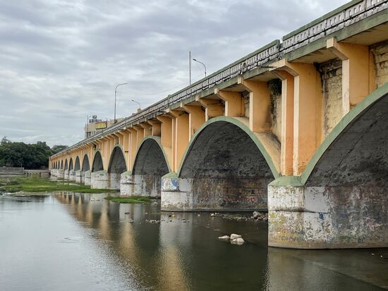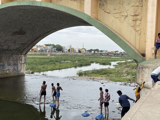 Irgendwann verlassen wir den Tempelbezirk und kommen zum Fluss. Hier gibt es ein paar Brücken, wobei mir vor allem die geschwungene Bogenbrücke sehr gut gefällt. Darunter spielen Kinder im schmutzigen Wasser und am Ufer wird Wäsche gewaschen. Das Wasser scheint nicht tief zu sein und windet sich um einzelne grasbewachsene Inseln, auf denen sogar ein kleiner Tempel steht.