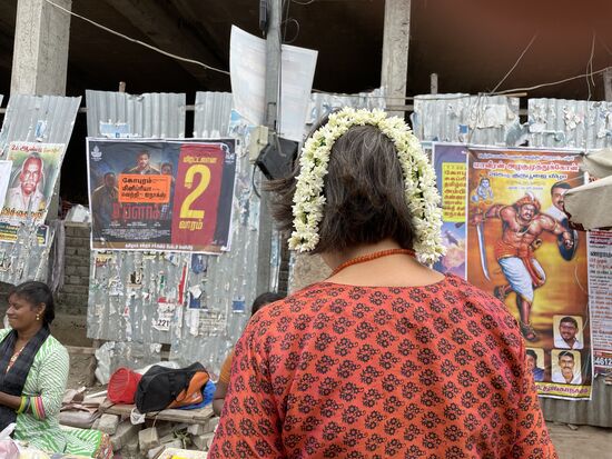 "Nein, nein" meint ihre Kollegin, die neben ihr sitzt und macht ein entsprechendes Zeichen mit Daumen und Zeigefinger, Bla, bla, das ist viel zu viel. Sie schneidet einen kurzen Strang und fängt an, ihn in meinen Haaren festzumachen. 50 Rupien, meint sie dann und damit bin ich einverstanden. Sie will mich fotografieren und ich überlasse ihr kurz mein Handy. Und da ist er, dieser Moment, wo man das Gefühl hat, jetzt grad einen grossen Fehler gemacht zu haben. Was macht sie mit meinem Handy? Ist sie bereits abgehauen, während ich glaube, dass sie hinter mir steht und mich fotografiert. Drehe ich mich jetzt um? Will ich diese Aufnahme, ist es das wert?