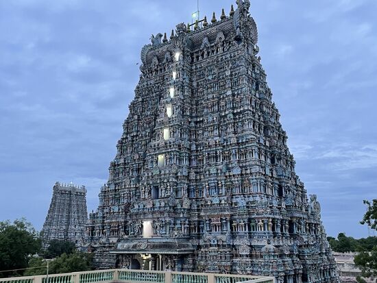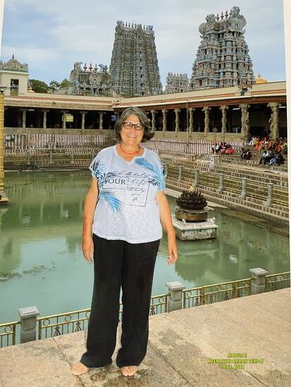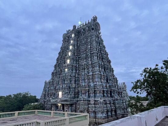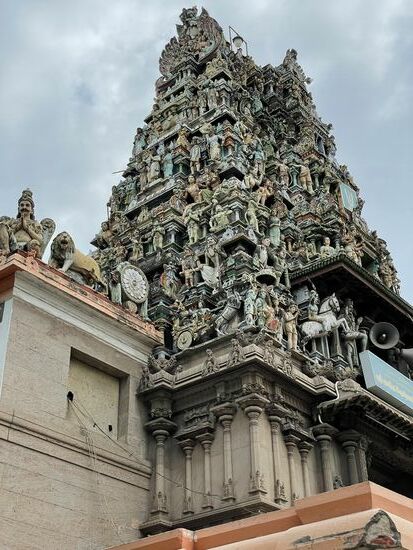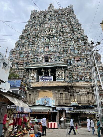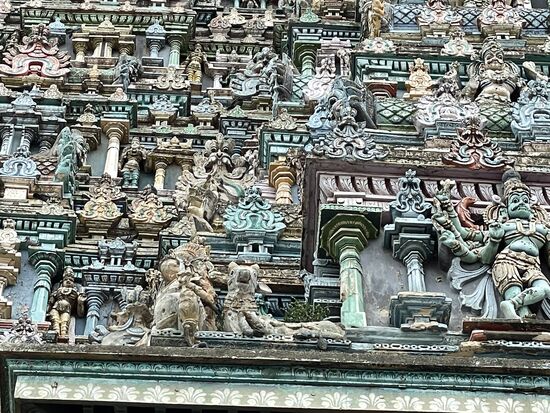 Die Tempelanlage ist dem Gott Shiva, respektive vor allem seiner Gattin Parvati gewidmet. Mein Guide erzählt ausführlich die Legende des Ortes von Shiva und seiner Gattin Minaski, die unter dem Namen Parvati verehrt wird. Sie wurde wegen einer Sünde ihres Vaters mit drei Brüsten geboren, verlor aber nach einer Profezeiung die dritte Brust, als sie ihren zukünftigen Mann, den Gott Shiva erblickte. Das Kind aus dieser Verbindung war Murugan, einer der beliebtesten Götter der Hindus. Alles in allem also eine wirre und wilde Geschichte, die auf vielen Bildern und Skuplturen im Innern erzählt wird.