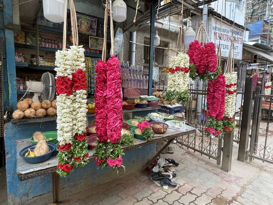 Die Blumenbinderin möchte mir einen Blütenstrang verkaufen. Auf meine Frage meint sie keck: 200 Rupien. Ich winke ab, sehe ihr lieber zu, wie sie mit geschickten Händen die kleinen Jasminblüten aufknüpft.