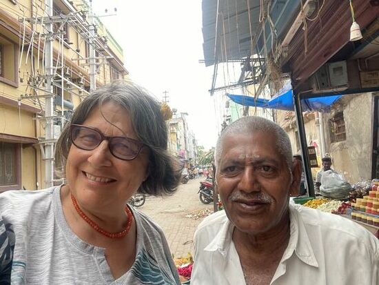 Hier gibt es auch wieder die Händler mit den Blüten. Meine Jasminblüten habe ich im Zimmer gelassen, sie geben ihm das richtige Parfüm. Der alte Mann mit den langen Girlanden, die um den Hals gehängt oder als Gaben für die Götter bestimmt sind, schenkt mir eine kleine gelbe Rose, besteht aber darauf, sie mir selber mit einer Haarnadel ins Haar zu stecken.
