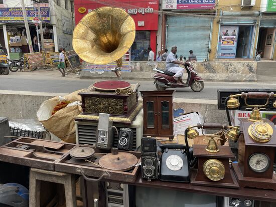 Interessanter ist da schon der Trödelstand mit einem alten Trichtergramophon, uralten Kameras, wo wahrscheinlich noch ein Kuckuck rauskommt, alten Telefonen mit goldenen Hörern, einem SpulenTonband, das der Verkäufer demonstrativ dreht. - siehst du, funktioniert noch... meint er schelmisch.