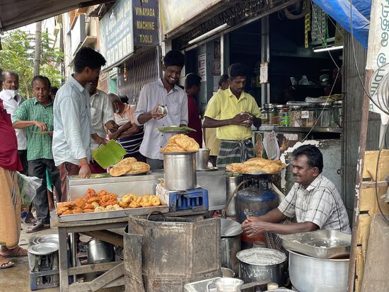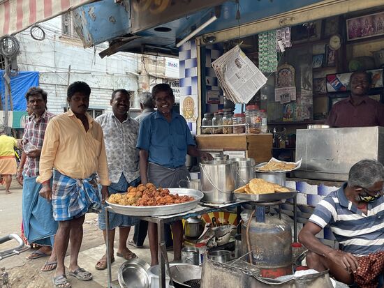 Auf dem Rückweg vom ATM, der wieder nur ganz kleine Beträge rausrückt, aber viel braucht man hier ja eh nicht und die Hotels zahle ich jeweils mit Karte - bleibe ich bei einer Strassenküche stehen. Es werden verschiedene Dinge angeboten, unter anderem frittierte Zweibelring-Bälle und natürlich Tee. Immer mit Milch und Zucker.