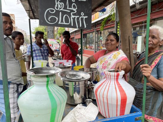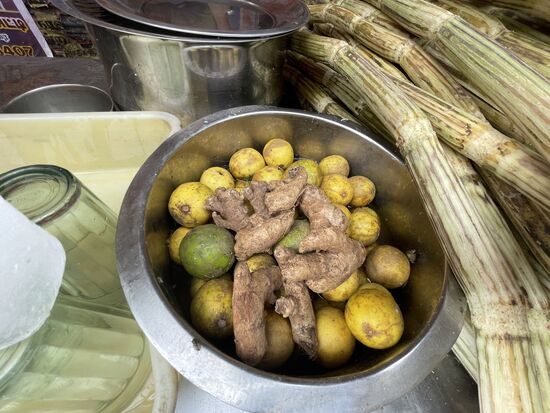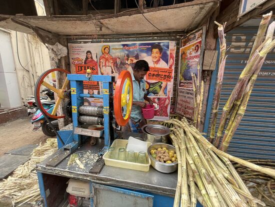Beim nächsten Stand bleibe ich etwas länger stehen. Der Mann bietet frisch gepressten Zuckerrohrsagt an. Zwei Stangen Zuckerrohr lässt er durch seine Maschine preissen, als diese fast nichts mehr hergeben legt er zwei halbe Limetten dazu und ein paar Kräuter sowie eine Scheibe Inwer. Dann noch ein Eiswürfel dazu, mein Drink ist fertig. Leider habe ich nur eine 100-Rupien Note und er hat kein Wechselgeld. Etwas ratlos versucht er es bei zwei andern Strassenhändlern und geht dann weiter weg. Es dauert fast zehn Minuten bis er wieder kommt, aber Wechselgeld hat er nicht bekommen. Er gibt mir die Note zurück. Doch ich will sie gar nicht, der Becher ist mir das wert. 100 Rupien sind ca 1,2 Franken.