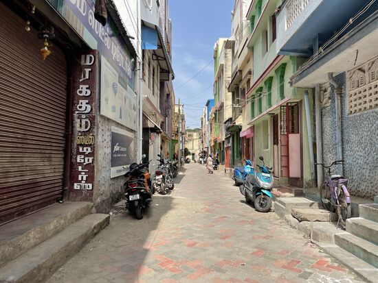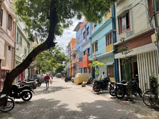 Ich gehe weiter, habe den Markt längst verlassen und komme in ruhigere Quartiere, mir farbigen Häusern. Irgenswo setze ich mich auf einen Mauervorsprung, sehe einfach ein wenig zu. Wie die Menschen vorbei gehen, zu Fuss, per Tucktuck oder auf dem Fahrrad. Eine Frau, die an einem öffentlichen Wasserhahn kniet und ihr Geschirr mit viel Seife schruppt, möchte ich gern fotografieren. Sie wackelt mit dem Kopf, oder schüttelt sie ihn. Ich bin nicht ganz sicher, aber der Kioskverkäufer nebenan, schüttelt ihn heftig mit einem betimmten 'Neinei' Das heisst nur also Nein. Ich hab verstanden, gehe weiter.