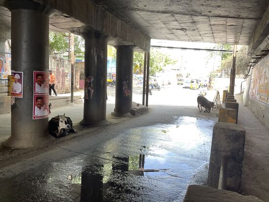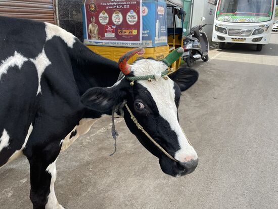 Unter der Brücke auf der die Bahn fährt, liegen Kühe. Sie glotzen mich an, scheinen müde zu sein. Müde von der Suche nach etwas Essbarem. Der weiss-schwarzen Kuh stehen die Knochen auf dem Rücken krass durch das Fell ab. Sie tut mir leid. Ob sie ihren Hindu-Tempel verloren haben, wo sie wahrscheinlich Futter bekommen könnten. Gelesen habe ich, dass die Kühe sich von essbarem Abföllen ernähren und dass ihr Dung ein wertvolles Brennmaterial ist und daher sorgfältig eingesammelt wird. Und zum Reinigen der Hauseingänge wird er, verdünnt mit Wasser ebenfalls verwendet.