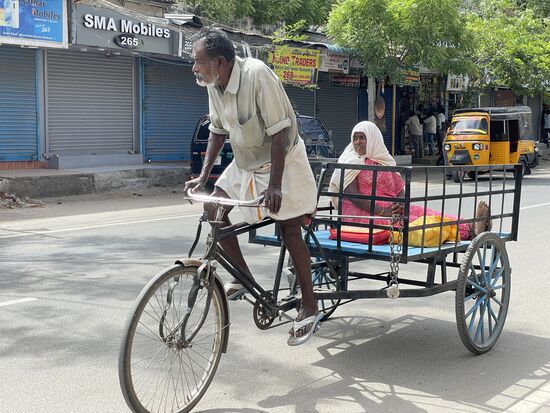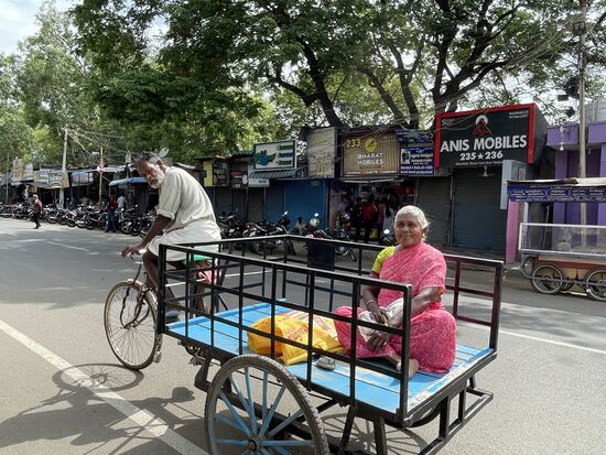 Als ein Rikschafahrer mit einer Frau auf der Ladebrücke langsam vorbei trampt, hebe ich die Kamera. Ob es die Frau stört, wenn ich sie fotografiere? Sie sieht mich und zieht ihr Kopftuch aus, setzt sich gerade hin mit gekreuzten Beinen und ruft ihrem Mann etwas zu. Der fährt tatsächlich noch langsamer, so dass ich die beiden einholen kann und die Fotos machen. Dass er mich etwas mürrisch ansieht, muss nicht heissen, dass er etwas gegen mich hätte, seine Frau hinen im Wagen lächelt jedenfalls vergnügt.