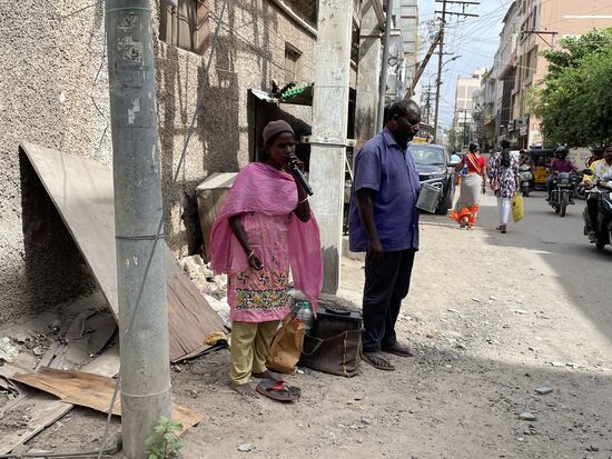 Die nächsten beiden lächeln mir nicht zu. Es sind zwei blinde Musiker. Ich bleide eine Weile stehen, sehe wie die junge Frau die Hände ausstreckt. Vielleicht legt jemand etwas hinein, vielleicht ist da jemand. Ich mache ein Video, als grad eine gruppe Frauen in farbigen Saris vorbei gehen. Einige geben ihr eine paar Münzen, eine gar eine Note. Dann schaltet die Frau ihre Musikbox eieder ein und singt in ein Mikrofon. der Mann, vielleicht ist es ihr Vater, schlägt mit seiner Sammelbüchse, in der sich ein paar Münzen befindet, den Takt dazu.