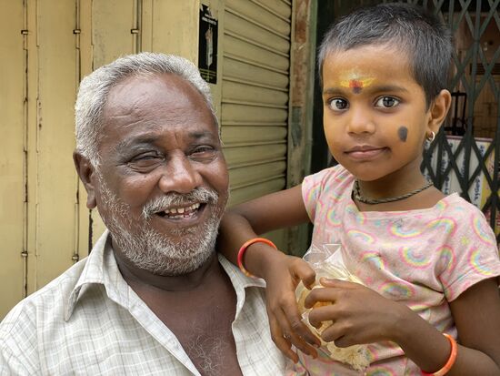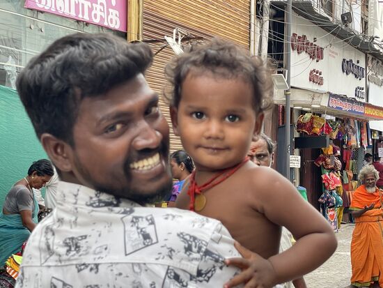 Dann zeigt er mir noch, wo ich die Tucktucks finde und ich wir verabschieden uns. Wieder habe ich unglaublich viele schöne Begegnungen hinter mir. Mein Herz und meine Kamera sind voller Bilder. Beim Vorbeigehen kaufe ich noch einmal einen Strang Jasminblüten. Sie werden ihren Duft in meinem Zimmer verbreiten und das letzte Lächeln des Tages schenkt mir ein junger Vater mit seinem Sohn auf dem Arm. Als ich ihm das Bild zeige, ruft er seine junge Frau dszu, sie soll es auch besundern.
