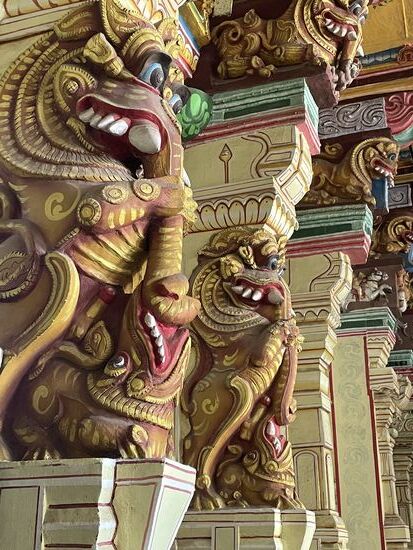 Sofort packt mich diese ganz spezielle Athmospäre, lässt mich ruhig werden, verlangsamt meinen Schritt. nimmt meinen Blick gefangen. Hinauf zur Decke mit ihren immer wieder anderen Ornamenten, zu den Fantasiefiguren oben an den Säulen, den grafischen Elementen an den dicken eckigen Säulen.