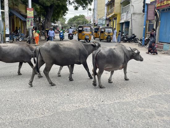 Beim Überqueren der Strasse muss man immer die Fahrzeuge im Blick behalten. Sie halten nicht an, fahren weiter, vor einem oder hinter einem. Stehen bleiben gilt nicht, das ist nicht vorgesehen. Alle hupen. Hupen für andere Verkehrsteilnehmer, für Hunde, für Fussgänger, hupen für sich, zur Freude, nur für die Kühe hupen sie nicht.