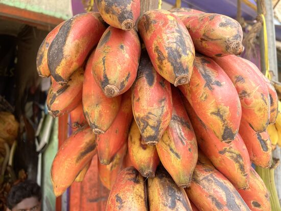 Ich schlendere weiter. Ich kann mir alle Zeit nehmen, mich umzusehen. Die roten Bananen am Stand unter die Lupe, respektive in den Fokus nehmen, die farbigen Fassaden mit den verschiedenen Schriften. Viel kann ich nicht lesen und wenn ich es lesen kann, weiss ich nicht, was es bedeutet. Doch das ist gar nicht so wichtig. Ich gehe am rechten Strassenrand, damit ich den Verkehr sehe, der auf mich zukommt.