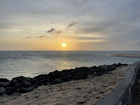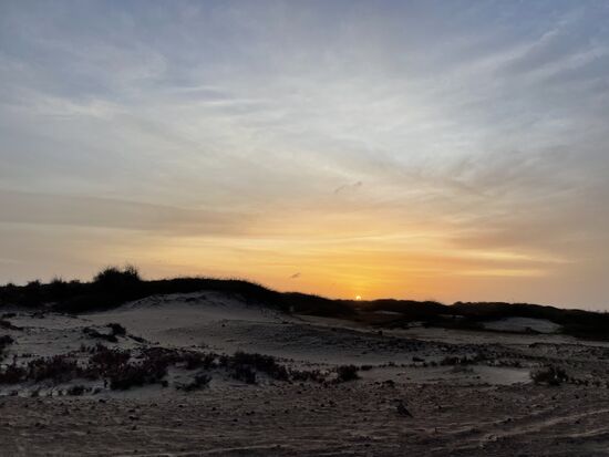 Eine schmale Landzunge führt hinaus aufs Meer, wir sind allein unterwegs, fahren mit 100 Sachen. Links wird der Himmel hinter den niedrigen Büschen langsam rot, die Sonne geht auf, doch das kann ich nur erahnen. Als wir am äussersten Punkt ankommen, steht sie schon eine Handbreit über dem Horizont. Natürlich ist es noch immer imposant, wie die Sonne jeden Morgen kommt, Pünktlich und mit aller Kraft bringt sie das Licht.