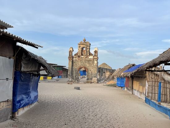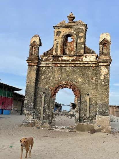 Beim Zurückfahren zeigt mir mein Chauffeur die Mauern einer alten Kirche Sie wurde 1964 durch einen Tsunami zerstört. Ich muss noch einmal nachfragen. 1964?