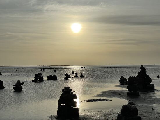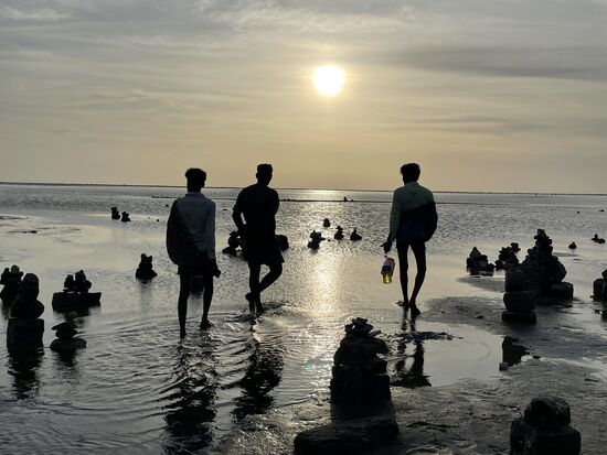 Als nächstes fahren wir zu einem kleinen Tempel, der ebenfalls sehr exponiert allein auf einer der schmalen Sandzungen steht. Hier schaue ich drei jungen Männern zu, die hinaus ins Meer waten Sie bieten ein schönes Fotosujet, doch was machen sie da draussen? Einer der uniformierten Polizisten, die mit dem Auto hier sind, klärt mich auf. Bei diesem Wasserstand gehen die Fischer zu Fuss hinaus und sammeln die Krabben von Hand, Weit draussen kann ich sie später sehen, es scheint, dass das Meer jetzt sehr niedrig ist. So niedrig, dass man sogar bis Sri Lanka laufen könnte. Natürlich muss man dabei durch Wasser waten, aber die lange Landzunge setzt sich unter Wasser fort.