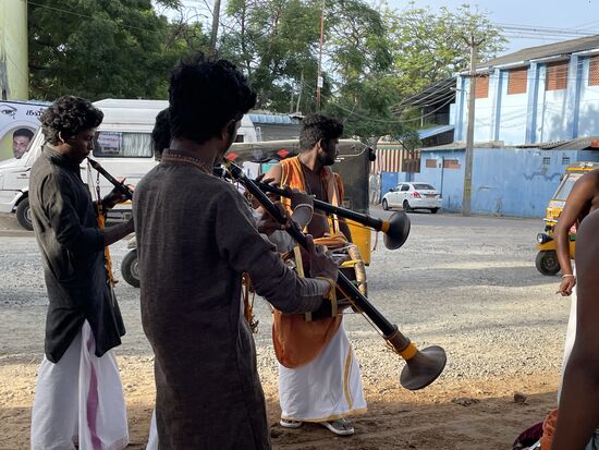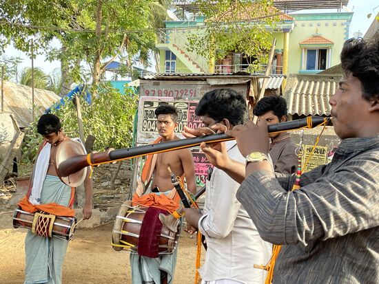 Es lohnt sich , denn plötzlich höre ich Musik. Markdurchdringend, erschütternd. Es sind ein paar junge Männer, die bei einer kleinen Gebetsstätte ein Morgenständchen geben. Ich mache ein paar Aufnahmen, worauf sie noch intensiver in ihre Instrumente blasen oder auf ihre Trommeln hauen, dann kehre ich zum Hotel zurück.