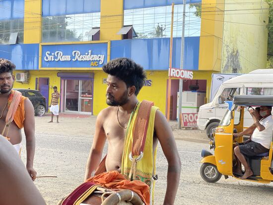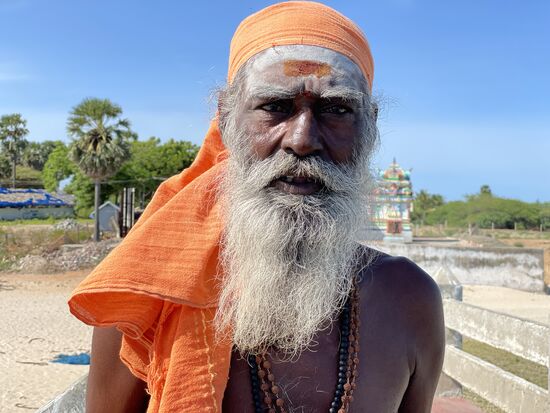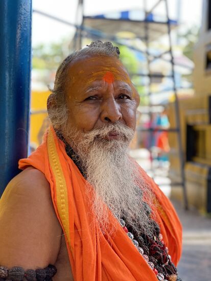 Der bärtige Mann, der beim Tempel sitzt, schenkt mir daraufhin ein oranges Bändelchen, das er mir satt ums Handgelenk bindet. Das soll ich wohl tragen, bis es zerfällt. Ich schenke ihm einen 10-Rupien-Schein - ich glaube, er hat mehr erwartet - und dann darf ich ihn fotografieren.