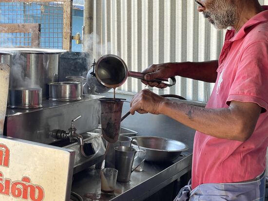 Natürlich ist der ziemlich überrascht, als ich schon wieder auftauche, er hat es sich nämlich grad mit einem Omlett und einer Flasche Wasser gemütlich gemacht. In einem der Imbissstände. Ich bestelle einen Chai für mich und sehe dem Koch zu, wie der das Gebäck herstellt, das ich schon in Madurai gesehen hatte.
