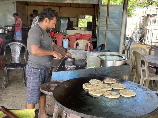 Es sind kleine runde Fladenbrote, was soweit gut nachvollziehbar ist. Wenn sie fertig gebraten sind, nimmt er sie von der heissen Platte, schichtet vier Stück aufeinander und schlägt mit den Händen darauf ein. Eine barbarische Art, die mir schon in Madurai sehr krass vorkam. Dann hackt er Zwiebeln, gibt ein Ei und ein paar Gewürze dazu. Dieses Omlett brät er dann auf der Platte und serviert es mit den Broten in einem Zeitungspapier. Ich habs nicht versucht, es sah aber gar nicht schlecht aus. Vielleicht später einmal, ich brauche für solche Experimente immer etwas mehr Zeit.