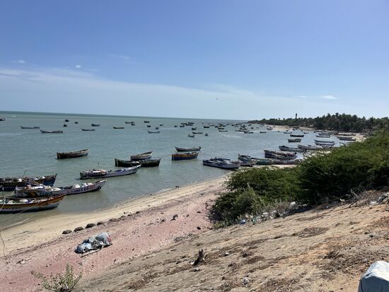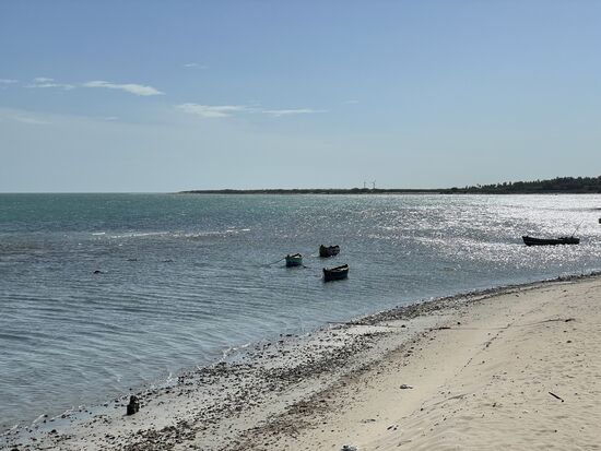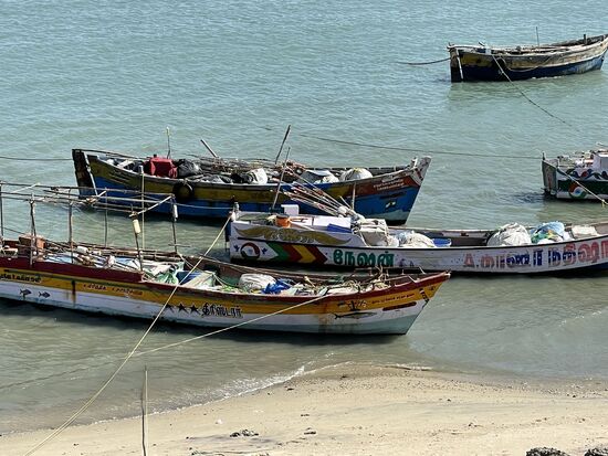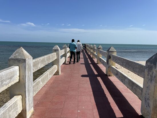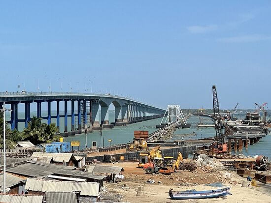 Unser nächstes Ziel ist die 2 km lange Panbam-Brücke, über die ich vorgstern hergekommen bin. Es gibt eine Strassenbrücke und eine Eisenbahnbrücke. Umdrehen darf man auf der Strasse nicht, darum fahren wir nicht auf die Brücke, halten vorher an, damit ich sie fotografieren kann. Neben der bestehenden Zugsbrücke wird eine neue Brücke gebaut. Sie ist bereits seit gute 4 Jahren im Bau und sollte in einem Jahr fertig sein. Auch diese Brücken wurden 1964 von Zyklon und Tsunami zerstört und es gab viele Tote. Die Brücken können sogar geöffnet werden, so dass grosse Schiffe passieren können Im Moment ist keines in Sicht, nur die kleinen Fischerboote liegen vor der Küste oder am Strand.