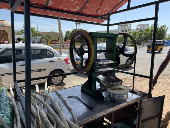 Wir fahren zurück, kommen wieder zum Memorial von Abdul Kalam, das jetzt geöffnet ist. Doch ich darf mein Handy nicht mitnehmen. Abgeben kann ich es auch nicht, soll es im Taxi lassen. Doch der ist bereits weitergefahren, wird wohl irgendwo im Schatten auf mich warten. Also suche ich schon wieder meinen Taxifahrer Er ist jetzt auf der anderen Strssenseite bei einem Getränkestand. Er hat sich eine frische Zitronenlimonade bestllt und ich lasse mir einen frischen Zuckerrohsaft zubereiten. Nebst einer Limone und einer Scheibe Ingwer gibt er noch ein paar intensiv duftende Pfefferminzblätter dazu. Einfach himmlisch - und sündhaft süss.