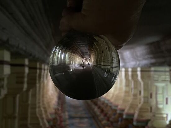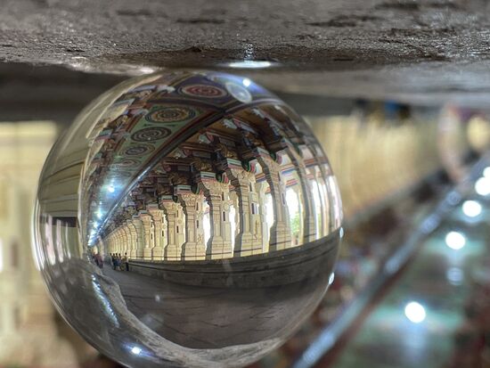 Und am späteren Nachmittag gehe ich noch einmal zum Tempel. Laufe durch die langen Gänge, Versuche noch einmal ein paar Eindrücke einzufangen. Diesmal habe ich meine Glaskugel mitgenommen, doch es zeigt sich, dass es ziemlich schwierig ist. Eigentlich müsste ich sie in der Mitte positionieren, irgendwo drauf stellen. Ausserdem irritieren die Scheinwerfer, sie bringen ungewünstre Lichtreflexe.