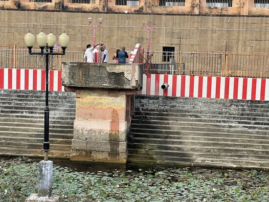 Ich setze mich in den Schatten beim Seerosenteich auf einen Absatz, schaue den Menschen zu, die ebenfalls hierher kommen und sehe zum ersten Mal, dass jemand Wasser aus dem Wasserspeicher schöpft. Mit einem kleinen Kessel holt er das Wasser herauf und übergiesst die Gläubigen, die anstehen. Für jeden gibt es drei Güsse. Bei dieser Hitze ist das eine angenehme Abkühlung und die Kleider sind schnell wieder trocken.