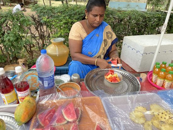 Also setze auch ich mich irgendwo in den Schatten auf eine kleine Mauer. Zuvor aber besorge ich mir bei der Verkäuferin einen frischen Fruchtsalat. Ja, ich weiss, man sollte damit vorsichtig sein, doch die Früchte sind so sauber präsentiert, die Kartonteller sauber verpackt, die Zahnstocher in Ordnung. Wenn mich etwas so sehr anmacht, muss es ok sein. Die Frau streut noch etwas Gewürzsalz darüber und das Ganze schmeckt tatsächlich wunderbar.