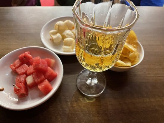 Vielleicht kann ich in der Bar etwas kleines essen, das wäre bedeutend netter, als in dem leeren Hotelrestaurant, oder noch schlimmer im Hotelzimmer. Leider, meint er, gibt es nur die paar Snacks zu den Drinks, mehr kann ich dir nicht anbieten. Schade.