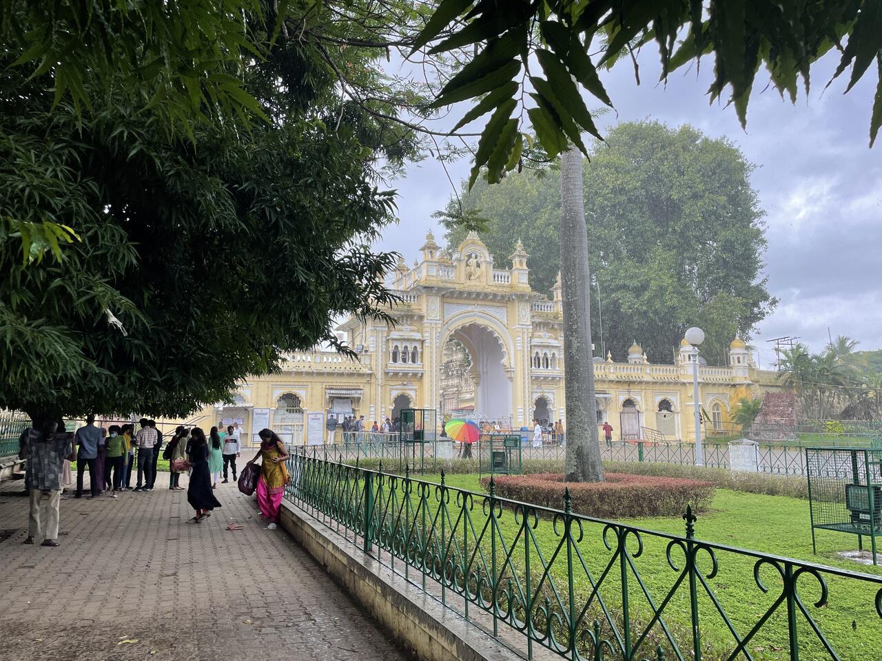 Grad bin ich aus dem Tucktuck ausgestiegen, das mich vor dem Eingang des Palastes ausgeladen hat, da fängt es an zu regnen. Erst nur ein paar Tropfen, ich gehe unter einen der dichten Bäume, halte mich in der Nähe des Stammes auf. Es wird ja wohl gleich wieder aufhören. Doch schon bald ergiessen sich Ströme vom Himmel, dieser scheint sich grad komplett auszuleeren. Schon tropft es auch durch die Blätter, ich werde wohl richtig nass werden. Die Unterschlüpfe beim Schlosstor sind natürlich längst besetzt, ich werde unweigerlich nass. Doch da naht Rettung. Ein einarmiger Verkäufer hat noch zwei Schirme im Angebot. Einen hat er soeben einem Inder verkauft, der den Preis noch um ein paar runter gehandelt hat, da schlage auch ich zu. Immerhin ist es ein sehr schöner Schirm, in Regenbogenfarben und richtig gross. Damit kann ich durch den Regen gehen und werde nicht patschnass im Palace ankommen.