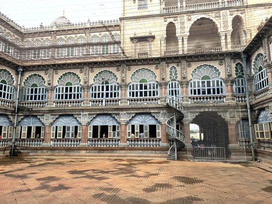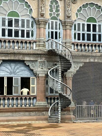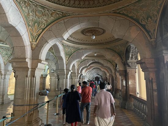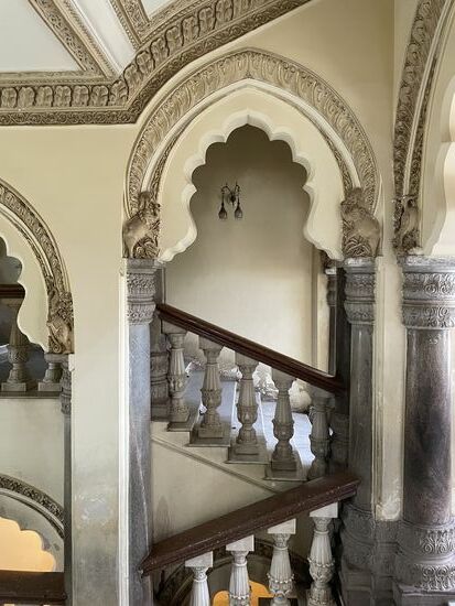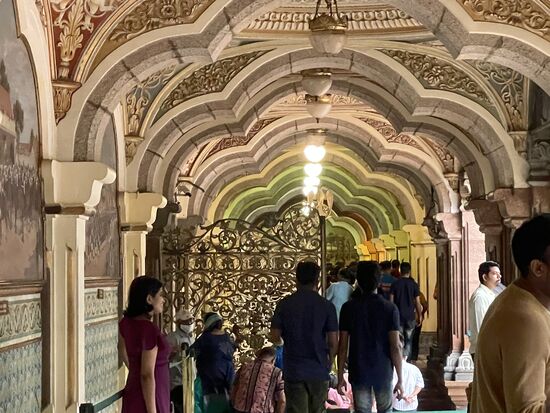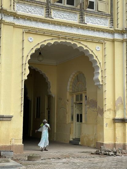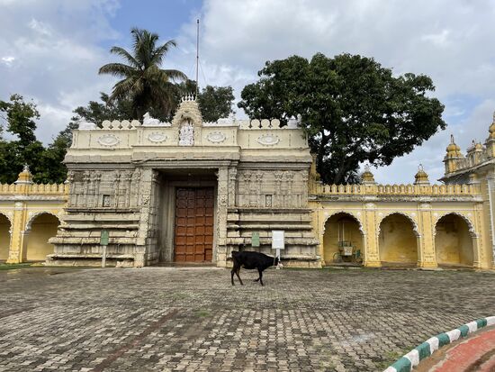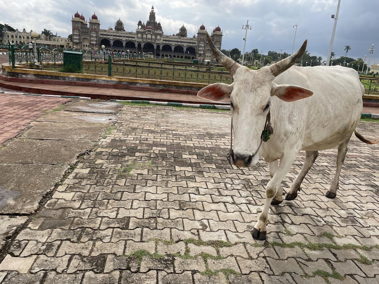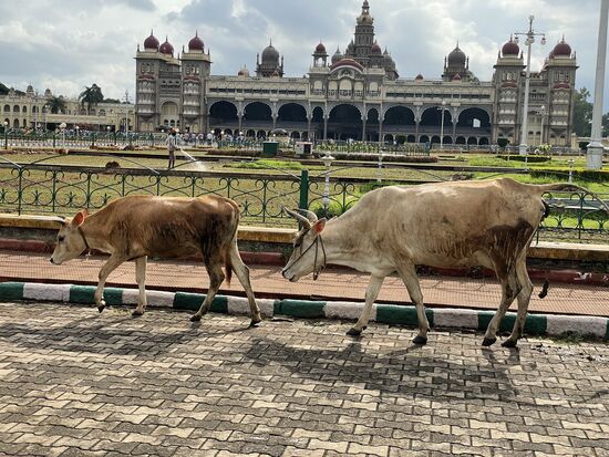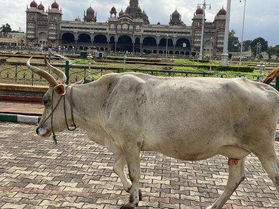 Dafür ist der Palast eindrücklich. 1912 wurde er nach 15-jähriger Bauzeit eingeweiht. Er war der Wohnsitz des damaligen Maharadschas, dessen Nachkommen auch jetzt noch einen Teil des Gebäudes bewohnen. Der Grundriss soll an den Buckingham-Palast angelehnt sein. Mit seinen vielen Kuppeln, den Türmen, Erkern und Rundbogen scheint er aber aus einer anderen Zeit zu stammen. Seine Breite macht es schwierig, ihn auf ein Bild zu bekommen. Gegenüber des Schlosses steht das nicht minder eindrückliche Eingangstor, das von frisch geschnitten Buchs-Elefanten gesäumt ist. Mir kommt aber in dem Moment grad eine andere Parade entgegen. Ein Teil der Palastkühe ist unterwegs, wechselt von der grünen Weide hinüber zum Tempel. Es sind ganz verschiedenen Kühe. Verschiedene Farben, Hornformen, Grössen. Da ich mich mit Kühnen nicht so auskenne, lasse ich eine genauere Beschreibung, lasse die Bilder sprechen.