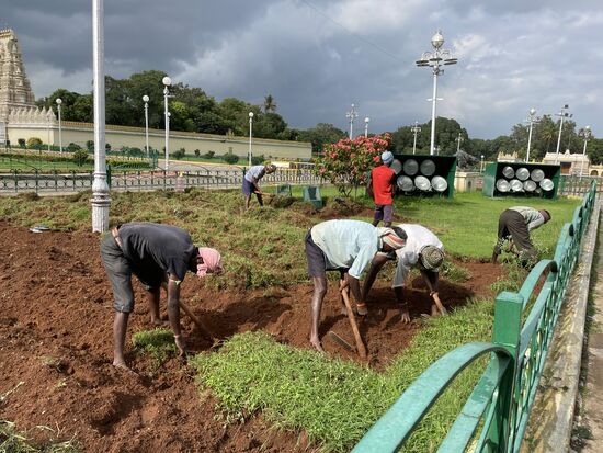 Ich lass es, behalte ihn unter dem Arm und versuche Fotos ohne Zoom zu machen. Schlendere durch den riesigen Garten und sehe den Gärtnern zu, die jetzt nach dem Regen die Beete wässern. War wohl doch nicht so viel Regen, wie es den Anschein machte. Andere Gärtner sind dabei, den Rasen abzutragen. Mit Hacke und von Hand tragen sie die oberste Schicht ab, laden sie auf den Anhänger eines Traktors.