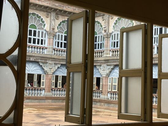 Wir steigen hinauf in den zweiten Stock, wo uns ein neuer Prachtssaal erwartet. Dicke Säulen, die aussehen, wie wenn sie mit Falten werfenden Tüchern überzogen wären, türkisfarbene Bogen, spiegelnde Böden. Was gibt es da noch zu sagen ausser: fantastisch, wunderbar, märchenhaft. Irgendwann gehen mit die Worte aus.