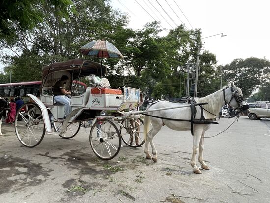 Vor dem Palast, dort wo die Tucktucks stehen, stehen auch ein paar hochrädrige Kutschen. Die werde ich mir bei anderer Gelegenheit genauer ansehen.