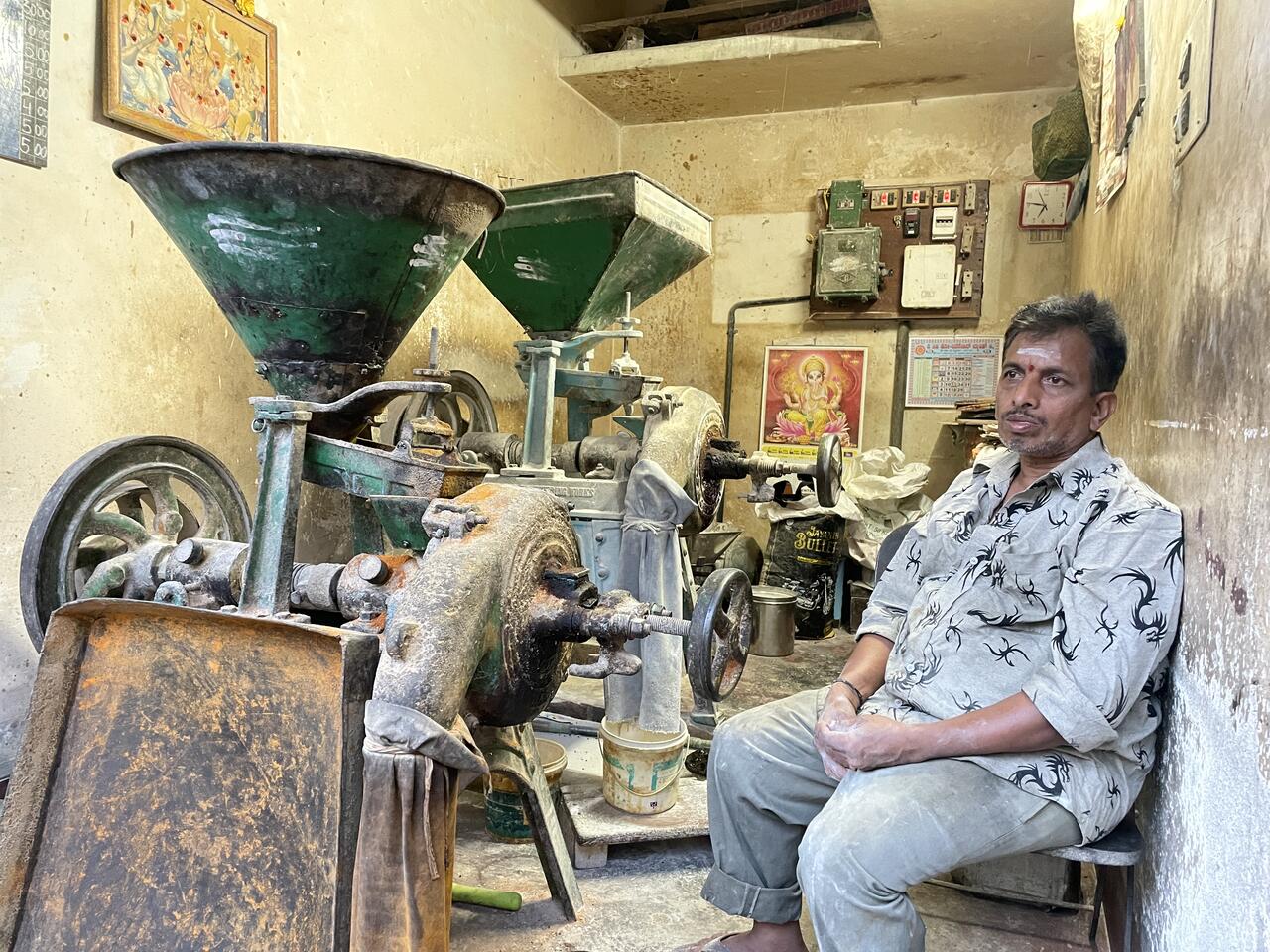 Eigentlich hatte er etwas vom Markt erzählt, aber dann zeigt er mir einen Gewürzmischer. Hier in dieser über 100 jährigen Maschine werden oben die Gewürze eingefüllt, unten werden sie in Säcke abgefüllt. Halte deine Nase daran. Es duftet... und genau so geht es weiter.