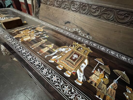 Der nächste Betrieb ist ein Holzverarbeiter. Künstler in jeder Beziehung. Es fängt beim Design an, das für jeden Auftrag neu gemacht wird. Es wird geschnitzt und die verschiedenensten Hölzer zu Intarsienbilder zusammen gestellt. Nichts gemalt, sagt er stolz und fährt mit der Hand über die farbigen Bilder. Alles aus verschieden farbigen Hölzern. Einzig die weissen Stellen, die früher aus Elfenbein waren, sind heute Plastik. Ja, das ist schade, doch da führt kein Weg daran vorbei. Elfenbein ist verboten.